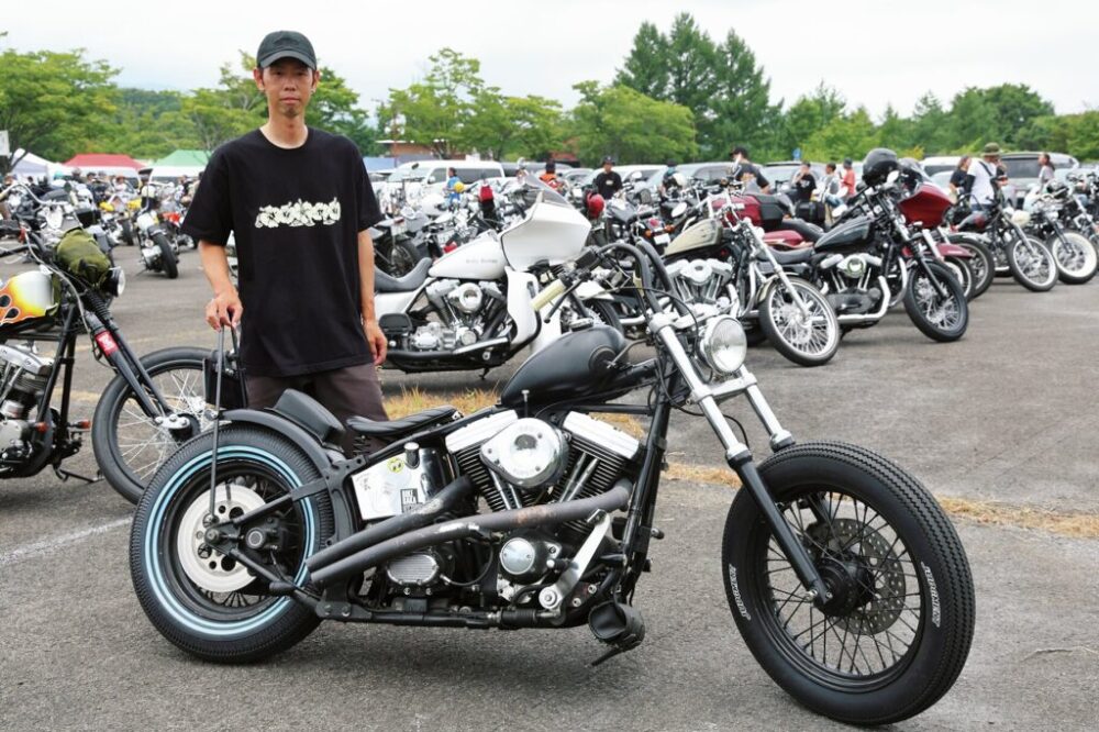 「ゴーストラン、毎年楽しみにしてます」というテツヤさんの愛車は、エボ・ソフテイルのよさをセンス抜群に引き出したチョッパー。オーナーの渋い雰囲気にピッタリです。スモールタンクと社外のスプリンガーフォークに交換しているせいかコンパクトにまとまっていてクールですね~。
