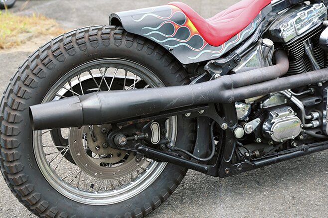ツインカムのヘリテイジがフリスコ風のチョッパーに変身。ハイマウントしたスポーツスタータンクとノーマルよりコンパクトなS&Sのエアクリーナーのせいかエンジンの迫力も増して見えます。フロントホイールを19インチにしてオフロードタイヤをチョイス。タイヤギリギリのシート&リアフェンダー、アップしたステップとフレイムスのペイントなど、ヤンチャな感じがカッコいい!