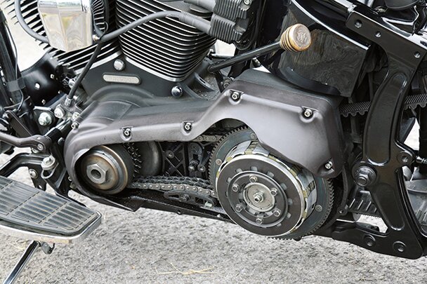 純正カバーをカットしたオープンプライマリーにビックリ。トラブルはないらしい。ハンドシフトへの変更もポイント。
