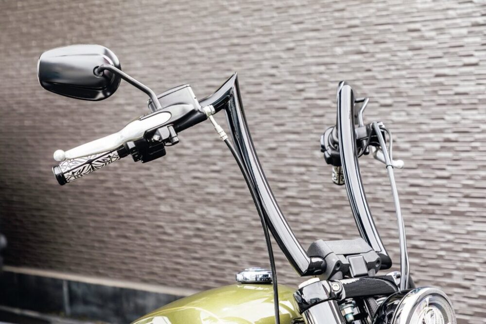 大きく反り返った形状が独特の存在感を放つ般若バー。FXBBなら高さ14インチで純正ケーブルが使用可能。クランプ部分1インチ用で、装着しているブラックのほか、クロームもあり。ちなみに下の写真は話題の2インチタイプで、クランプ部分1-1/4インチ用。車種によって取り付け部分の幅が2種類用意されている。2インチ般若バー ブラック22万円 クローム24万2000円