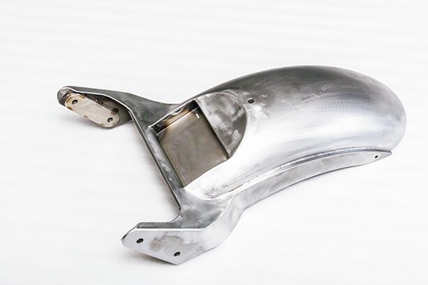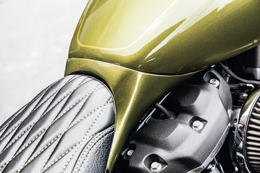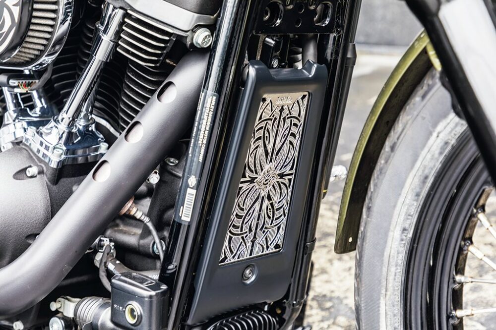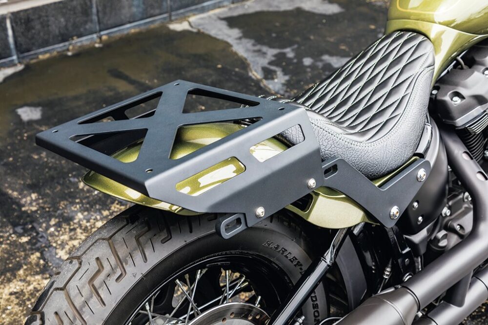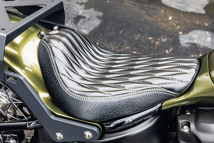 ストリートボブの小ぶりなガソリンタンクとシートとの間に生じる隙間を埋めることで、スムースなシルエットを作り出すタンクストレッチカバー。専用のシート、または対応加工したシートと同時装着する。タンクストレッチカバー3万800円(ブラック塗装)1万9800円(無塗装)
