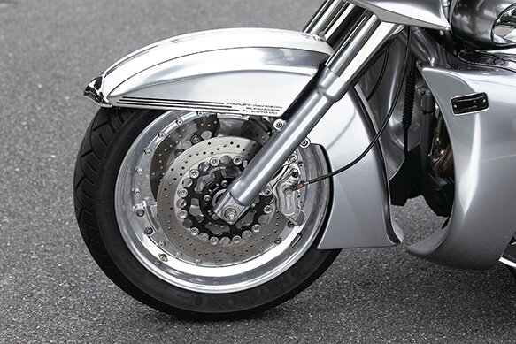 走行時に車体前方で発生する空気の乱流を切り裂き、後方へいなす形となったフロントフェンダー。ツアラーらしいフォルムも魅力だ。