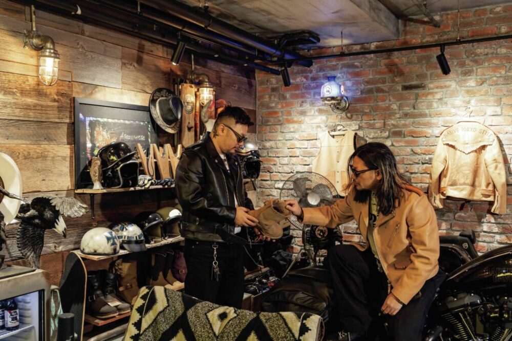 ここに紹介するガレージは、双子の兄弟、YacciさんとMitsuさんが主体となって作り上げた空間だ。二人のバイクが並ぶその場所は、スタッフの通勤バイクを並べるスペースでもあり、時には打ち合わせスペースとしても活躍する。原宿の旗艦店に隣接する環境だけに、当然ただの車両保管庫ではなく、ブランドの世界観を発信する基地にもなっているわけだ。