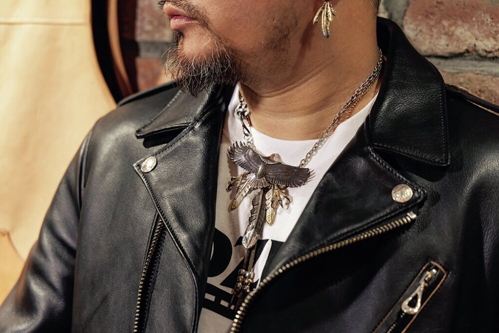 Yacciさんの首元を飾るのはロングホーンのバッファローストーンにゴールド&シルバーのフェザーを重ねたカスタム。