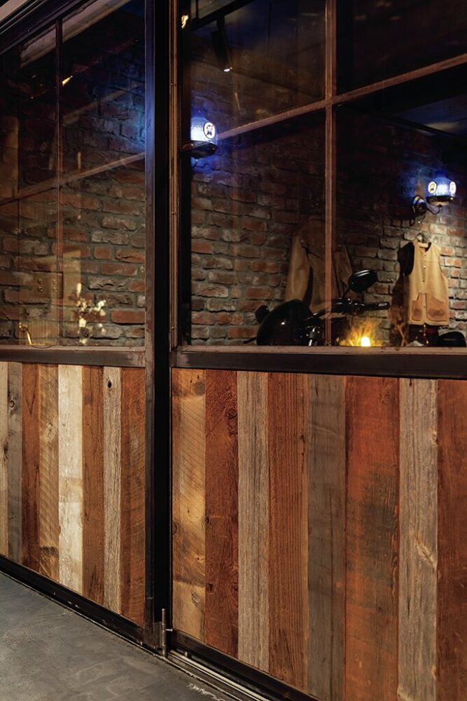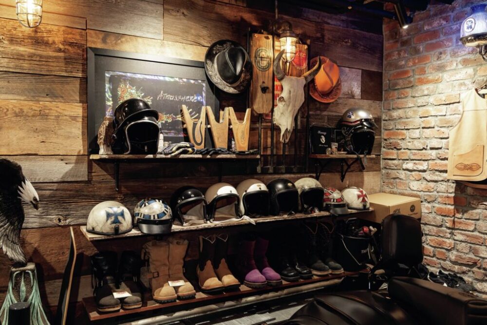 古材を組み合わせた奥の壁にはヘルメットやブーツなど、バイクに乗る際に使用するギアの棚を設置。すべて装飾ではなく実用品なのでリアルな雰囲気。
