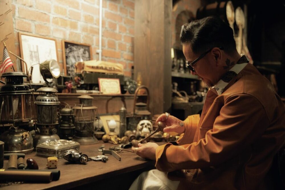 トラディショナルなホットロッドやハーレーが鎮座するその横には、ランタンや工具など、いにしえの時代に作られた“本物”が所狭しと並ぶ。2017年にスタートしたアウトドアブランド「オールドマウンテン」は、破竹の勢いでフォロワーを拡大し、昨年夏に初の旗艦店「オールドシアター」をオープン。このガレージは、そのオールドシアターの一角を占める代表・辻ノ内さんの趣味部屋だ。