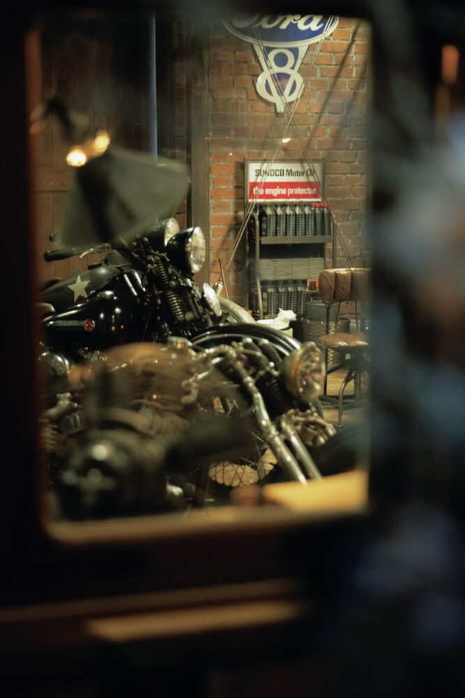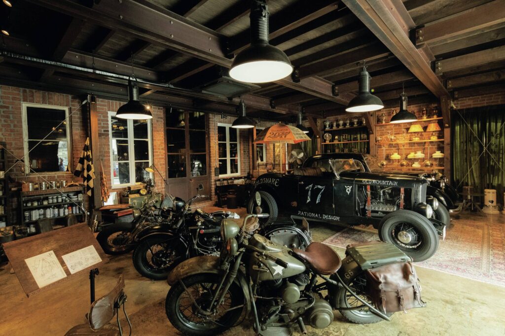 ガレージはプライベートな空間だが、ブランドの世界観の発信源でもあるため、喫茶スペースに隣接し、ガラス越しに中を見ることができる。旧いアメリカ映画に出てくる納屋のガレージのような圧巻の世界観が作り上げられている。