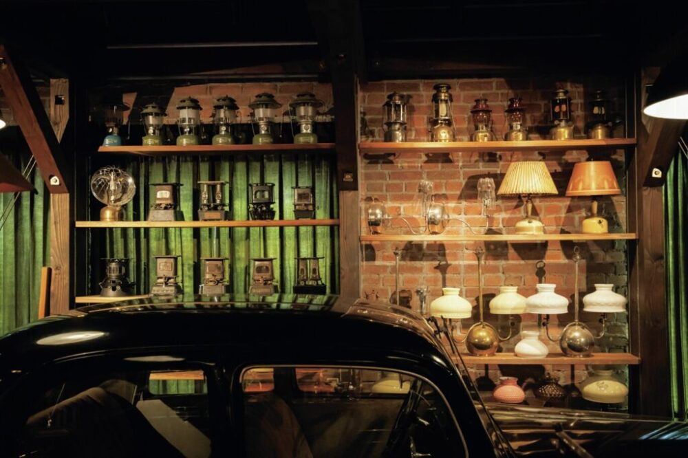 ガレージの棚にはヴィンテージランタンやストーブが並ぶ。キャンプなど、アウトドアレジャーで実用するものばかりだが、ミュージアムクラスの超希少モデルも所有。