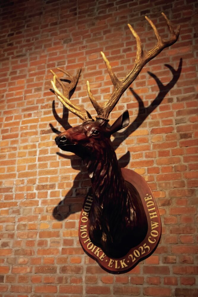 LEATHER ARTS & CRAFTS MOTOのレザーアーティスト、本池秀夫さんが手がけた実物大の“革の鹿”。すべて手作りだがうっとりしてしまうほどリアルな表情は必見。