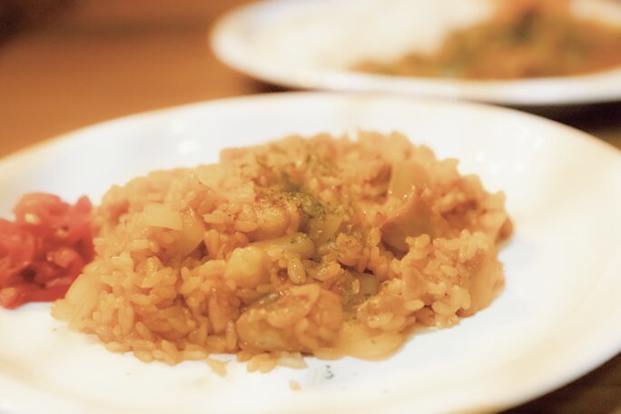 良い音、良い空間の中の食事は美味しく感じる、をコンセプトにフードはあえてシンプルに。看板メニューのチキンライスは驚くほどレトロで庶民的なスタイルだが癖になる味。