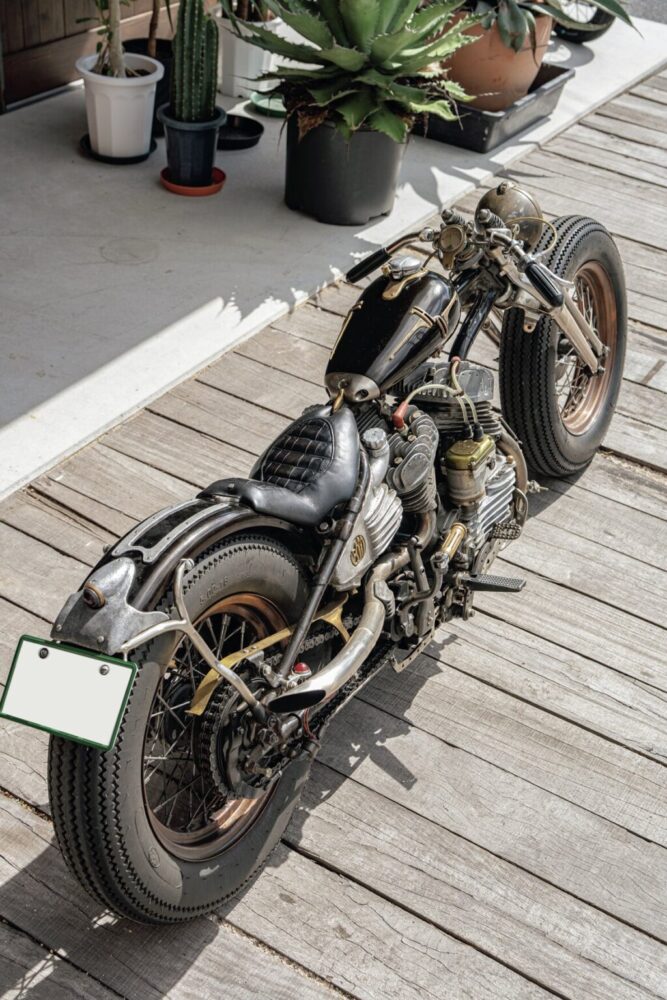 1946 H-D WL“OLD GOLD”|「CHABOTT ENGINEERING」木村信也さんがビルドした“OLD GOLD”。ZERO時代の名作のオマージュで、グースネックフレームによる低くシャープなシルエットに加え、木村節といえるメタルワークが冴え渡る。