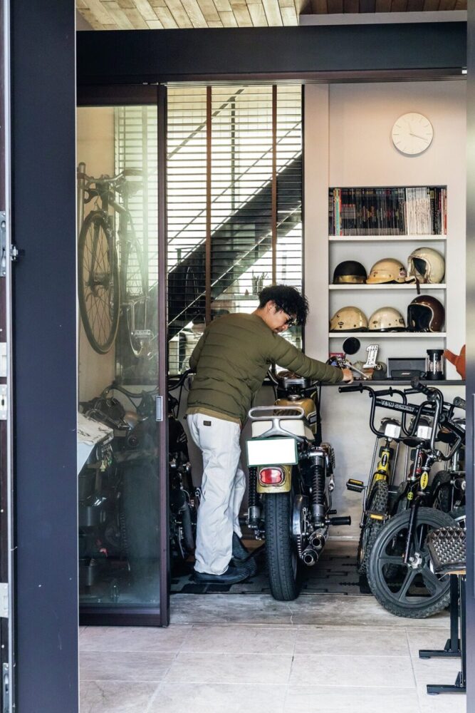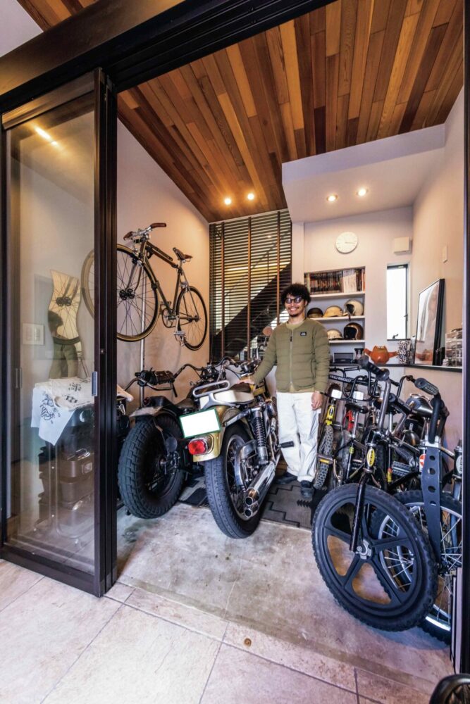 ガレージへの出し入れを考慮して玄関ドアは両開きで開口部が広いものを採用。ガレージ側もガラスの3枚引き戸なので、開口部が広く、そのまま押してバイクをガレージ内に入れることができる。玄関の外も含めて比較的フラットなので出し入れも簡単。