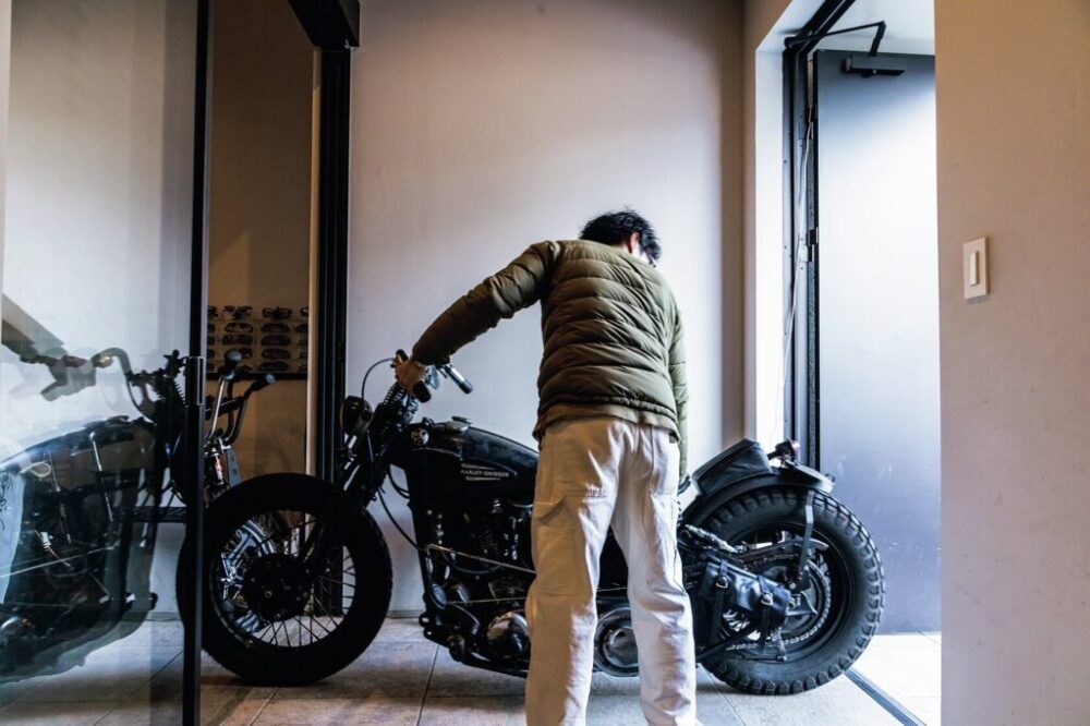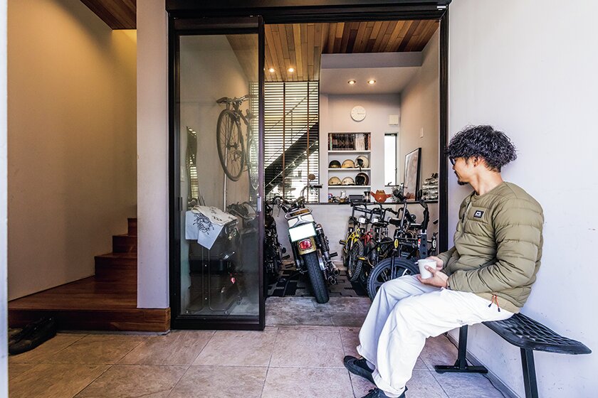 18歳のころからバイクに乗っている青山さん。以前に乗っていたという「ショベルヘッド」はカバーをかけて屋外保管だったそうで、家を建てる際には“安全な場所に愛車を保管できるスペースがほしい”と思っていたそうだ。今から10年ほど前に自宅を建てた際、玄関奥に四畳半ほどのスペースを確保し、2台のハーレーと旧い「シュウィン」の自転車をこの〝玄関内ガレージ〟に格納している。