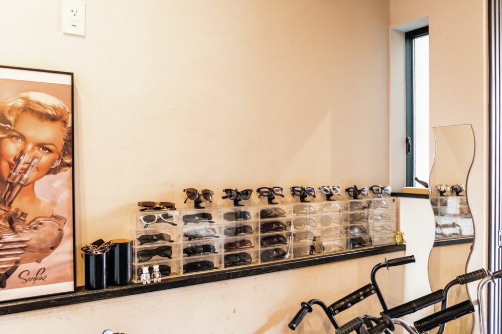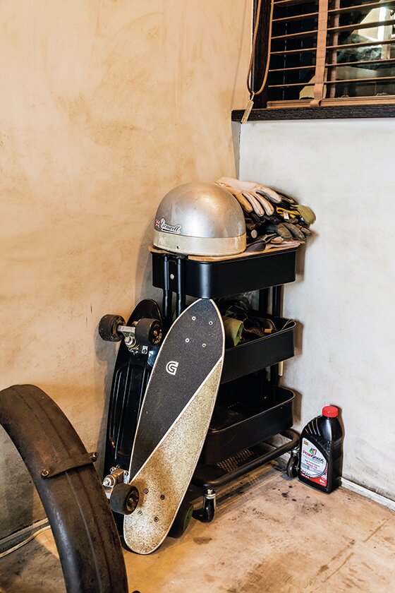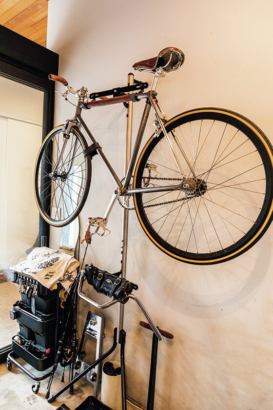 ガレージ内にはリビングとの壁面を使ってヘルメットなどを収納している他、段差を使って大好きなサングラスを並べたり、サイクルキャリアを使って高い位置にピストバイクを収納するなど、限られた空間を上手に活用している。