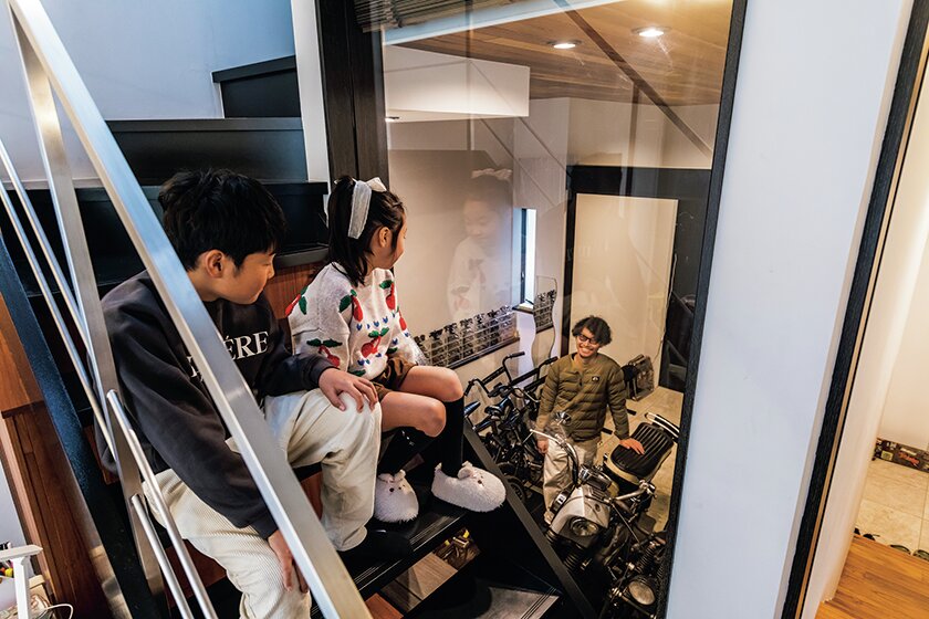 ご自宅はスキップフロア構造になっており、玄関を入ってガレージ脇に設置される階段を上がるとリビングが広がっている。このリビングとの間に大きなガラス窓を設置し、リビングに居ながらにして愛車を眺めることができる他、ガレージと玄関の境も3枚のガラス戸にすることで、ガレージ内は閉塞感がなく常に明るい雰囲気。これによってお子さんたちもガレージで過ごすパパを視界に入れることができるというわけだ。