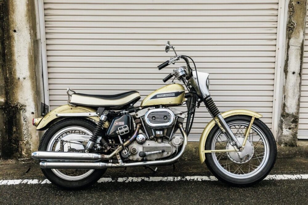1969 XLH|実は5年ほど前に入手していたものの、昨年ようやくナンバーを取得したというアイアン。もともとは赤だったが、知人のペインターにエイジングペイントを施してもらい、ゴールドでオリジナルペイントの雰囲気を再現。