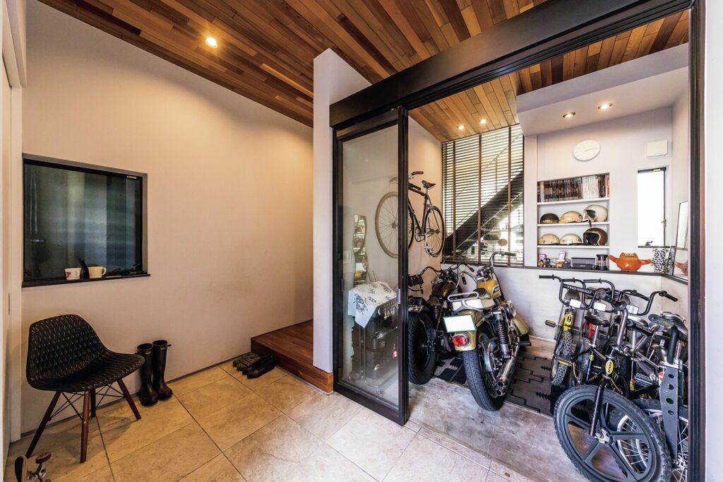 ガレージへの出し入れを考慮して玄関ドアは両開きで開口部が広いものを採用。ガレージ側もガラスの3枚引き戸なので、開口部が広く、そのまま押してバイクをガレージ内に入れることができる。玄関の外も含めて比較的フラットなので出し入れも簡単。