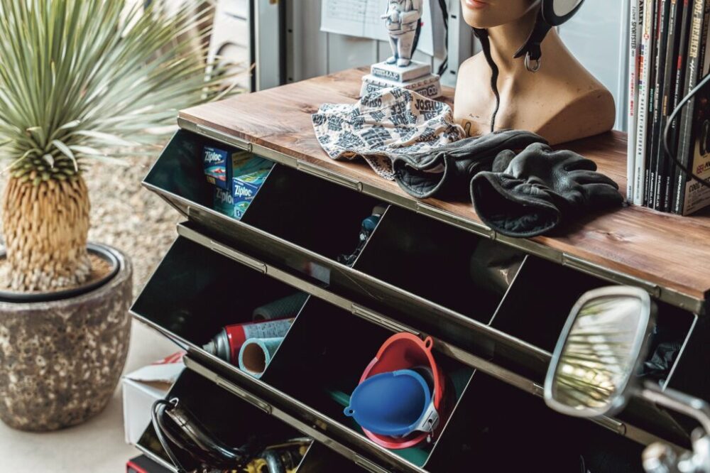 ウエスやクリーナー、パーツなどの小物類は、すべてミリタリーのラックに収納。ヴィンテージらしい鉄の風合いがマッチしている。