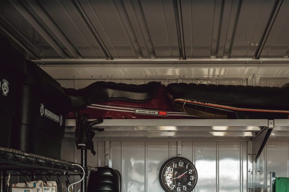 イナバ製のガレージは耐久性は言わずもがな、コンパクトながらも収納性に優れる。純正のボートテールを魅せるディスプレイとして活用する。