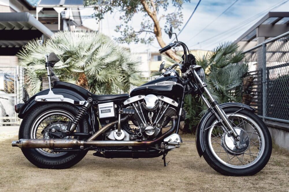 1972 FX1200|フルストック状態のFX1200を購入し、あえてこの年代の特徴的なボートテールを外し、シッシーバー付きのシートにカスタム。もともとはバーガンディだったが、新しくタンクを手に入れ、ブラックに塗装。