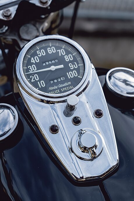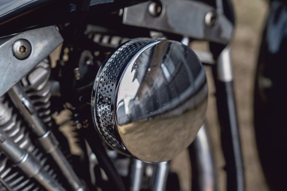 この年式の特徴的なシートとボートテールを取り外し、70sスーペリアのシッシーバーをカスタム。メーターはレアなポリス仕様の純正にチェンジした。
