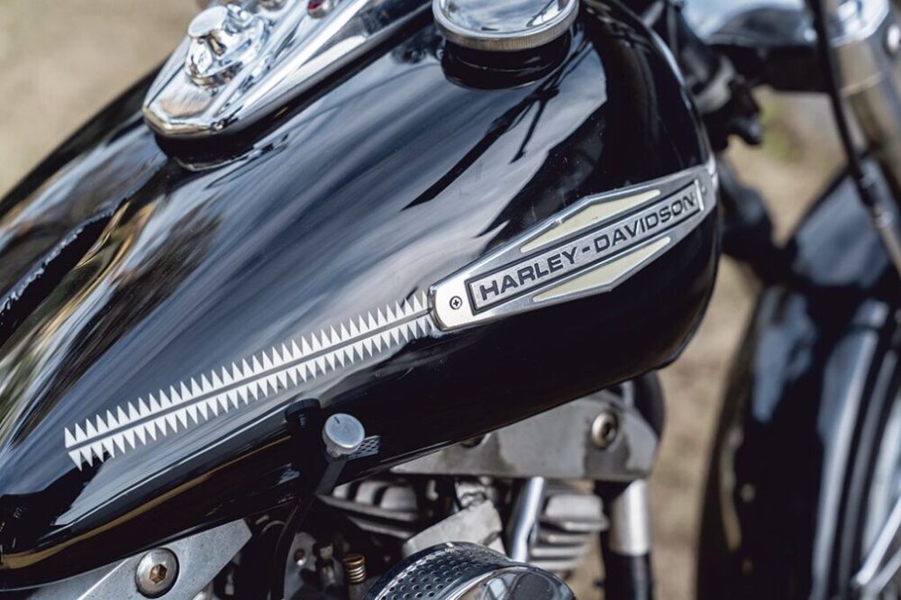 1971年製のFXの純正タンクを手に入れたので、ブラックにペイント。サイドにカスタムカルチャー好きな大塚さんらしい模様をペイントした。