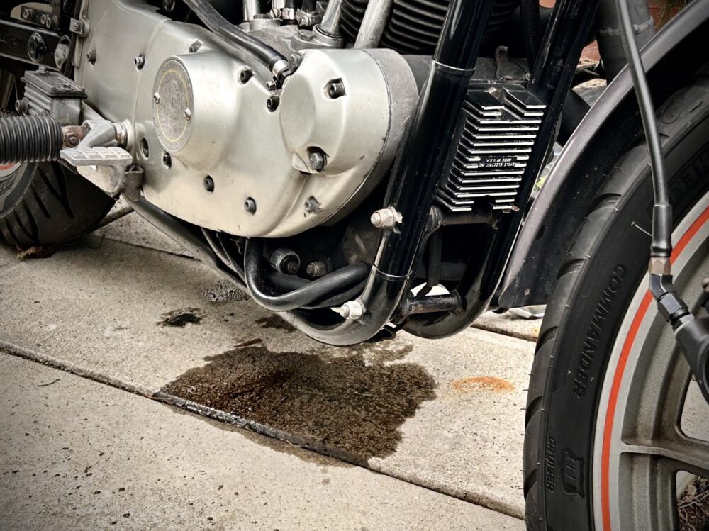 しかし……、である。以前のように通勤で毎日頻繁に乗らなくなった分、一度に乗る距離が圧倒的に増えたのだが、そんなある日、XRに乗ろうとカバーを外したところ、エンジンの下に大きなオイルの染みが……‼ ちょっぴり染み跡が点々とある程度ではなく、もはや水たまり寸前な感じで、これはまずいとサンダンスで診てもらうことに。するとオイルタンクに入ったクラックが原因とのこと。聞けばこれはXRだけに限らず、オイルタンクにバッテリートレーを取り付ける構造のリジッドマウントのスポーツスターにありがちなトラブルなのだという。もしかして一度に乗る距離が増えたことも関係している……⁉