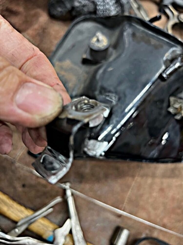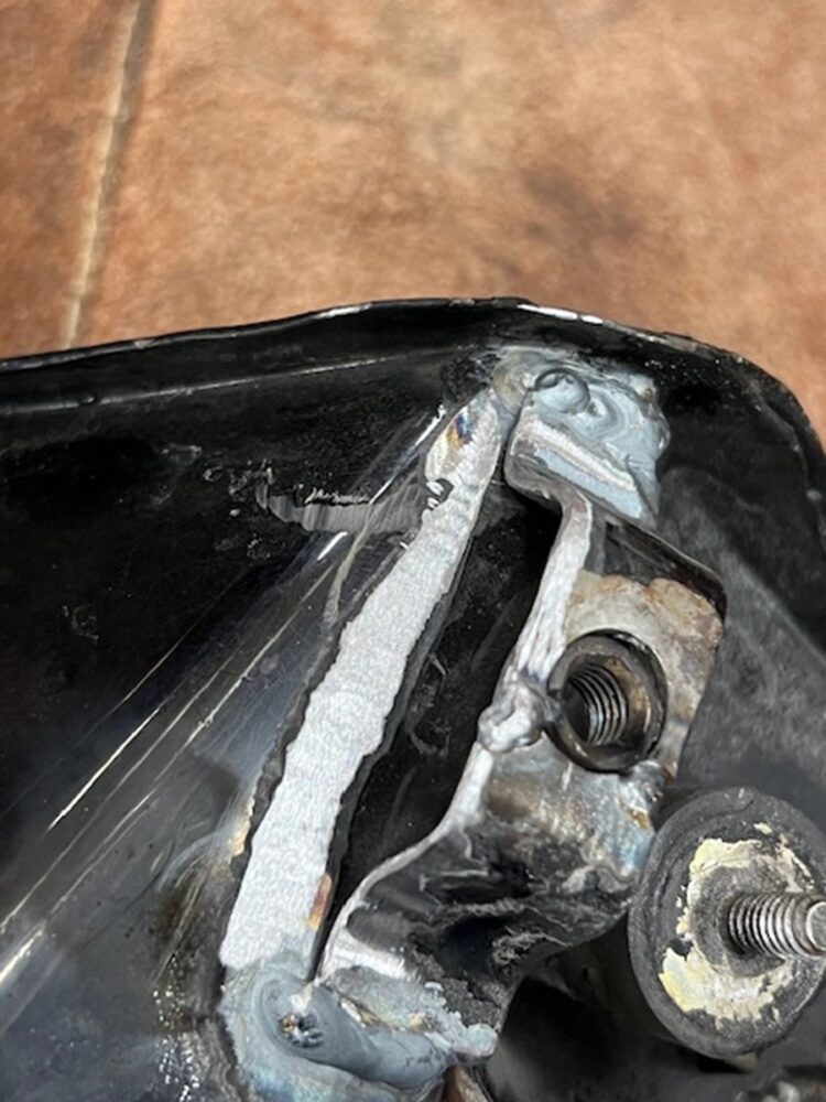 オイルタンクに備わっているバッテリートレーを支えるステーが折れ、そこにクラックが入ってオイルが漏れていた。これはXR1000だけでなく、リジッドマウントのスポーツスターにもありがちなトラブル事例だという。
