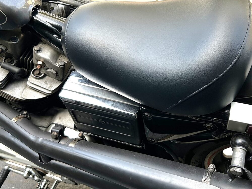 リジッドマウントのスポーツスターと同じく、オイルタンクのちょうど反対側にバッテリーがあるのだが、これが走行中に結構揺れる。重量物であるバッテリーが振動などで揺れることで、タンク裏のステーが破損しやすいのだ。