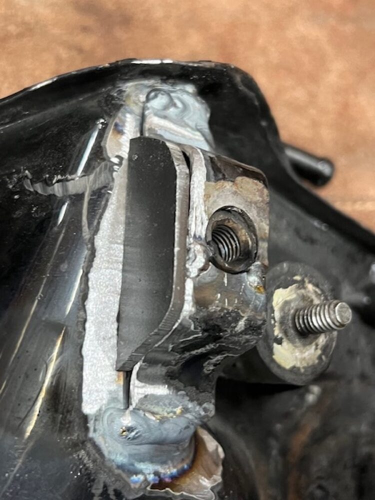 まずは溶接でもとの状態に復元。しかしステーそのものが薄いプレート状で強度的に弱く、このままでは再び破損してしまう可能性が高い。そこで周辺の強度を上げるべくステーの形状にぴったり合うようにスチール板を切り出して側面に溶接。これにより飛躍的に強度が上がって破損しにくくなった。結構いいでしょ。