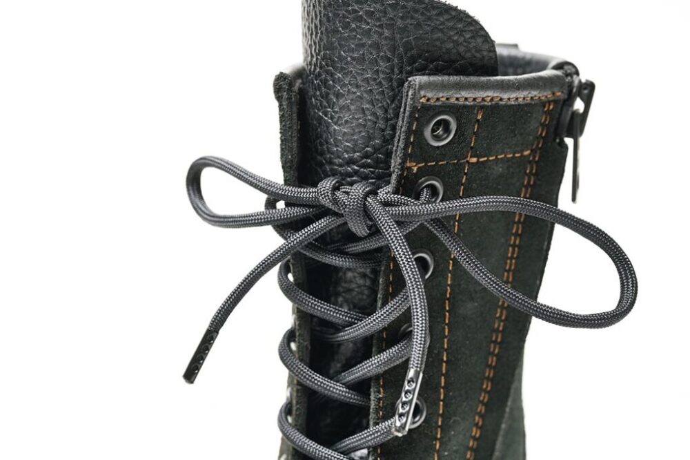 シューレースは耐久性と耐摩耗性に優れたパラコード。エンド部には黒のセルが付く。ハトメもブラック仕様だ。