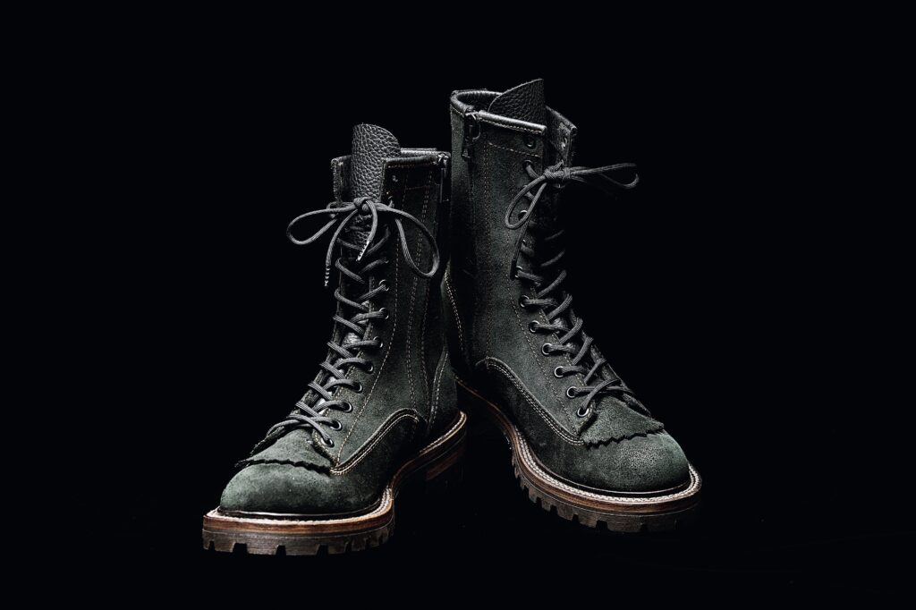 このブーツのコンセプトはズバリ“オトナの黒”。個性的かつ、上品でスマートな印象にしたかったので、ブーツの表情を決定づける厚手の革にブラックの“ラフアウト”をチョイスして、ハーレー乗りが履くのにふさわしい無骨なルックスになっています。さらにSPPNの通常商品では真ちゅう製のハトメにゴールドのUNIVERSALファスナーが使用されていますが、これらをブラックアウト。そのうえステッチの色や見た目のワンポイントになるフォルスタンを採用して、上品な印象の一足に仕上げました。木型は日本人の足に合うEワイズを採用し、疲れにくく履きやすいことも魅力です。8万2500円