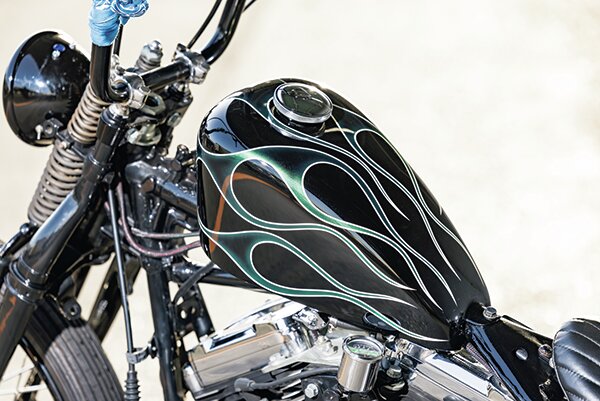 ガスタンクはスモールスポーツスタータンク。深いグリーンのフレイムスに差し色のアイボリーが効いたペイントは「FFF(スリーエフ)」が担当。