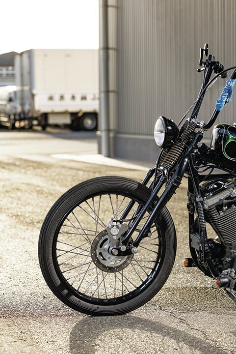 フォークは信頼性の高いW&Wの74スプリンガーを採用。エイプバーとの相性も抜群。ブレーキも同じくW&Wのディスクブレーキで制動力を確保する。