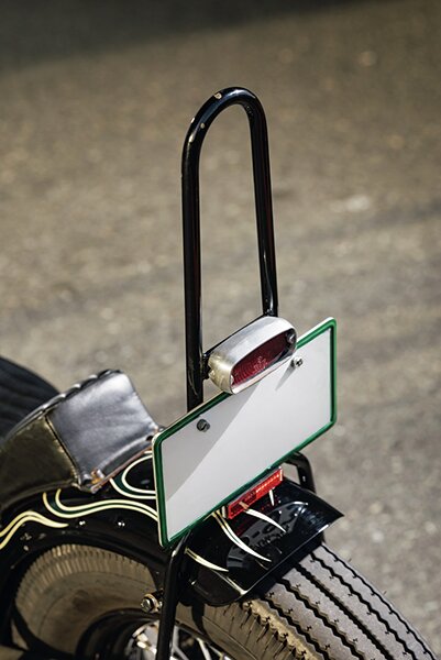 シッシーバーはオーナーからの要望で荷物を積みやすい長さを確保。テールランプはモートーン製ゴートLEDテール。アルミボディでナンバー灯も備える。