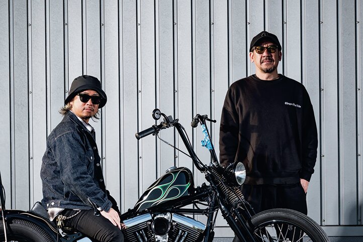 オーナーの立花さん(左)とビルダー大久保さん。このソフテイルをきっかけにハーレーの魅力を知った立花さんは、写真上のポリスの他、S&Sモーターを積んだナックルのチョッパーも所有する。