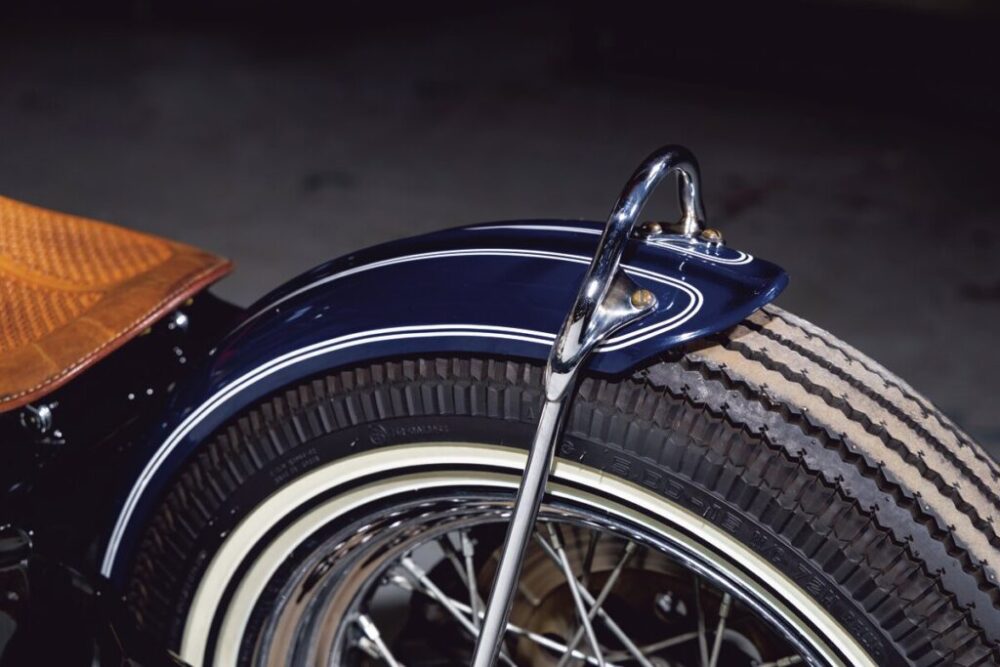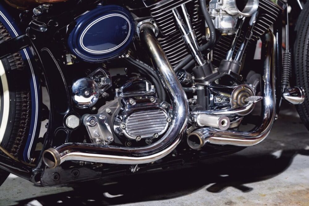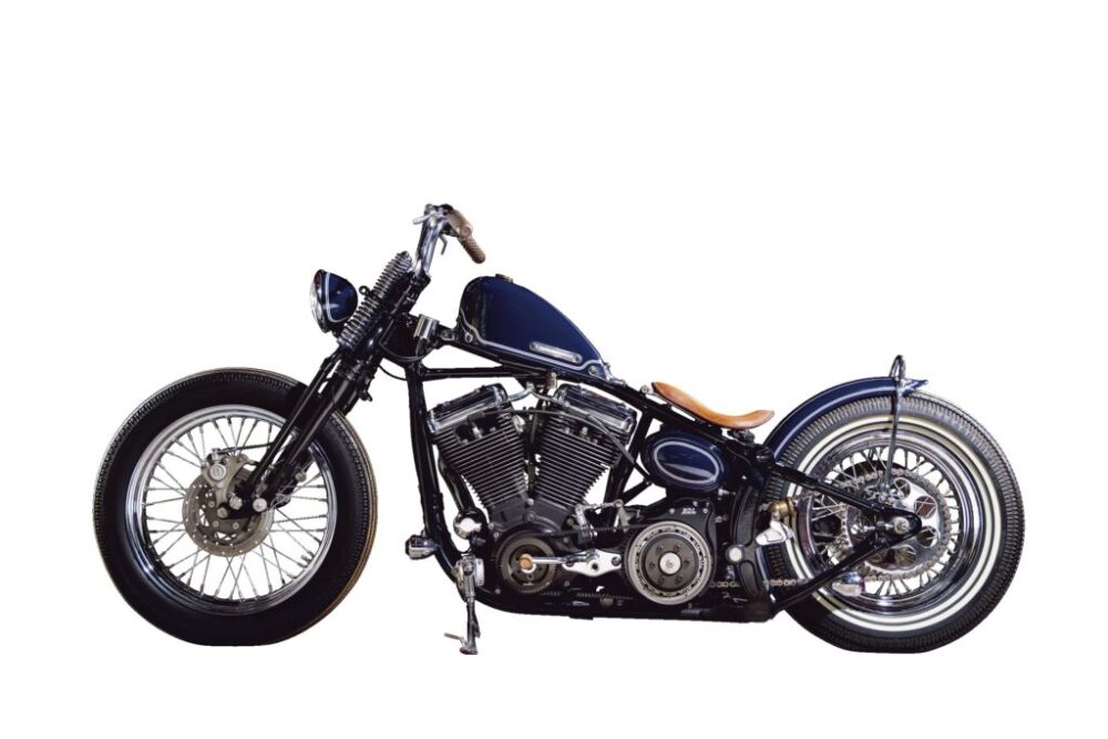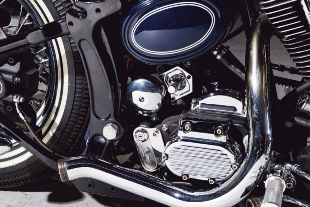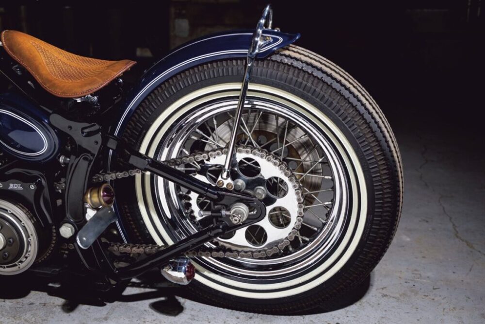 ショベルのリジッドチョッパーを意識したことから、ベルトドライブをチェーンに換装。タイヤのホワイトリボンが車体を走る2連のラインとシンクロする。