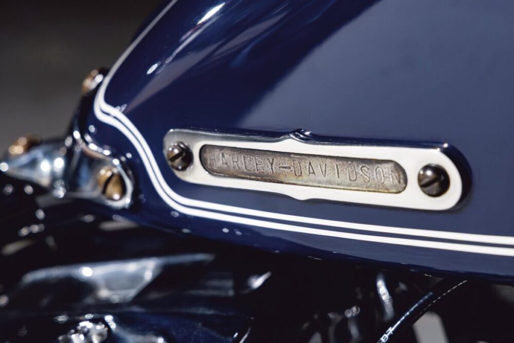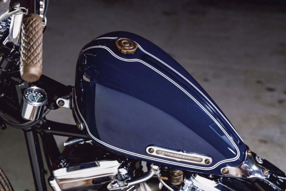 城戸さんはソフテイルフレーム最大のネックだと感じていたシート下のフレームワークをカットしてリメイク。これによってタンクのマウント位置に融通が効き、シートとの距離を理想的なものにできるという。フロントエンドはW&W製の74スプリンガーを選択してヴィンテージ感を高め、リア16インチとのバランスを考えフロントを19インチに。全体的に丸みを帯びた暖かみのあるデザインをコンセプトとしており、各所にその造形を垣間見る。
