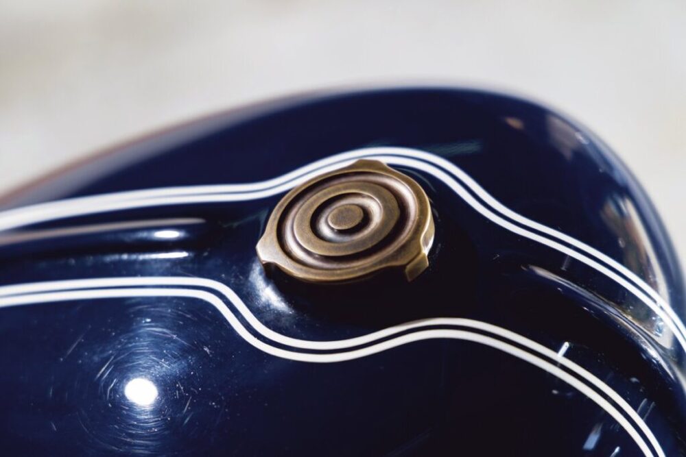 センターにリブを立て、キャップは真鍮で製作、エンブレムを作り、ステー部分にも個性的な造形を配置。タンクだけでも見せ場の多さに驚く。