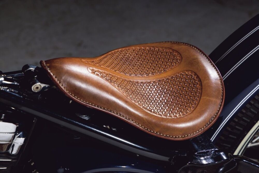 シートは顧客でもある職人さんの手によるもの。細やかなスタンピング模様が美しい。シートを跳ね上げるとオイルタンクやバッテリーにアクセスできる。