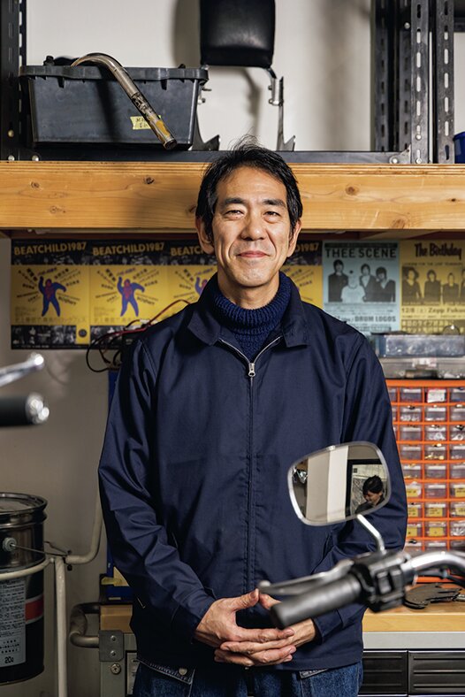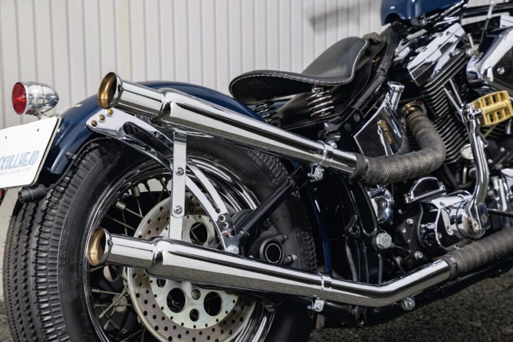 ネイビーを基調としたマシンに、同系色の差し色としてグリップやシフターにブルーを配色。スカルを閉じ込めたような愛らしいシフターは木村さんがレジンで作った一点モノだ。美しいカーブを描くようなリアのフェンダーブレースの造形に、メタルワークとセンスの高さを垣間見る。