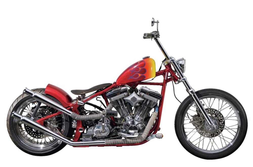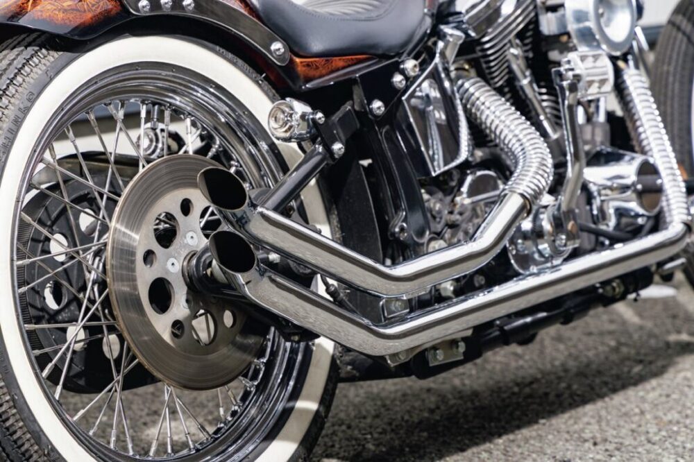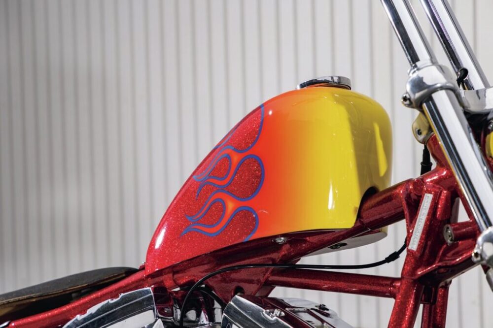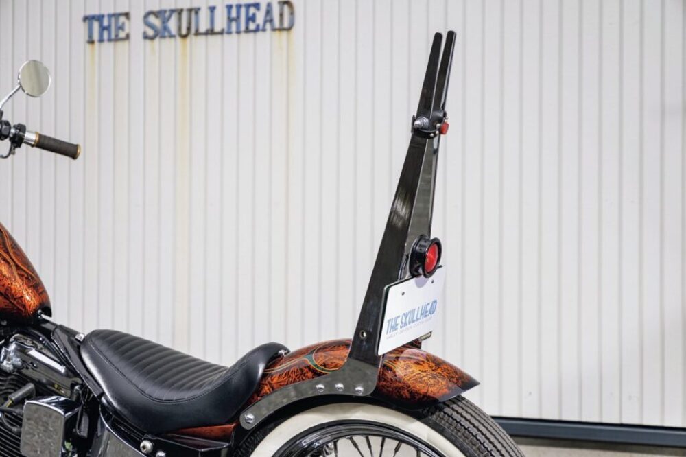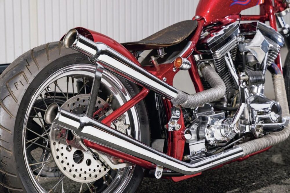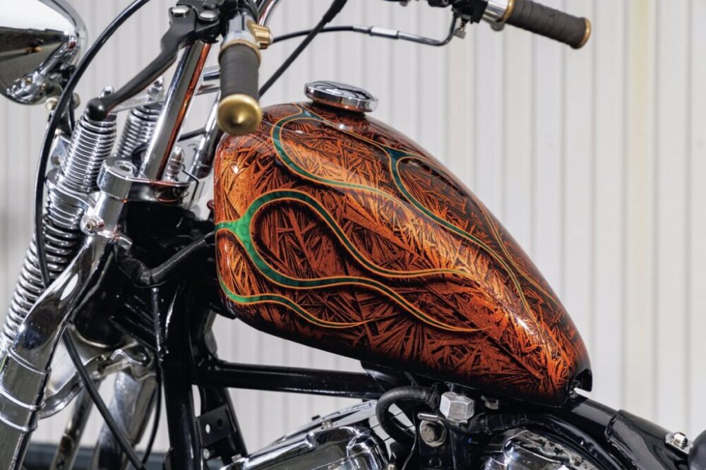 クラック塗装と呼ばれる技法を用い、キャンディオレンジにペイントされた外装にグリーンのピンストライプが強烈に映える。シッシーバーはあえてアクスルからではなく、フレームからのストラットシッシーバーを製作。丸棒や角棒ではなく、平鋼から作られた無二の造形が印象的だ。