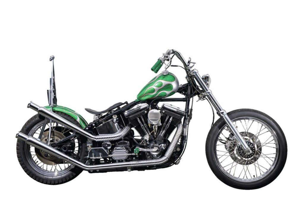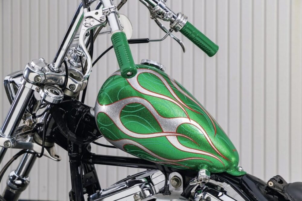 グリーンの車体にシルバーのフレイムスが映えるチョッパー。この流麗なラインのフレイムスは木村さんが手がけており、その多彩さに驚かされる。オーダーは細身のチョッパー。フォークはスポーツスター用、リアのホイールサイズは18インチというチョイスでナローなスタイリングを実現させた。