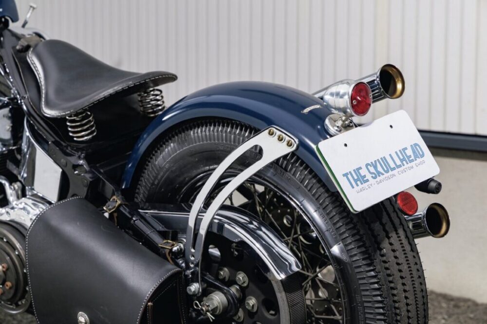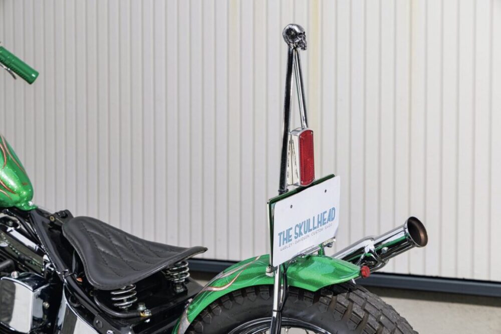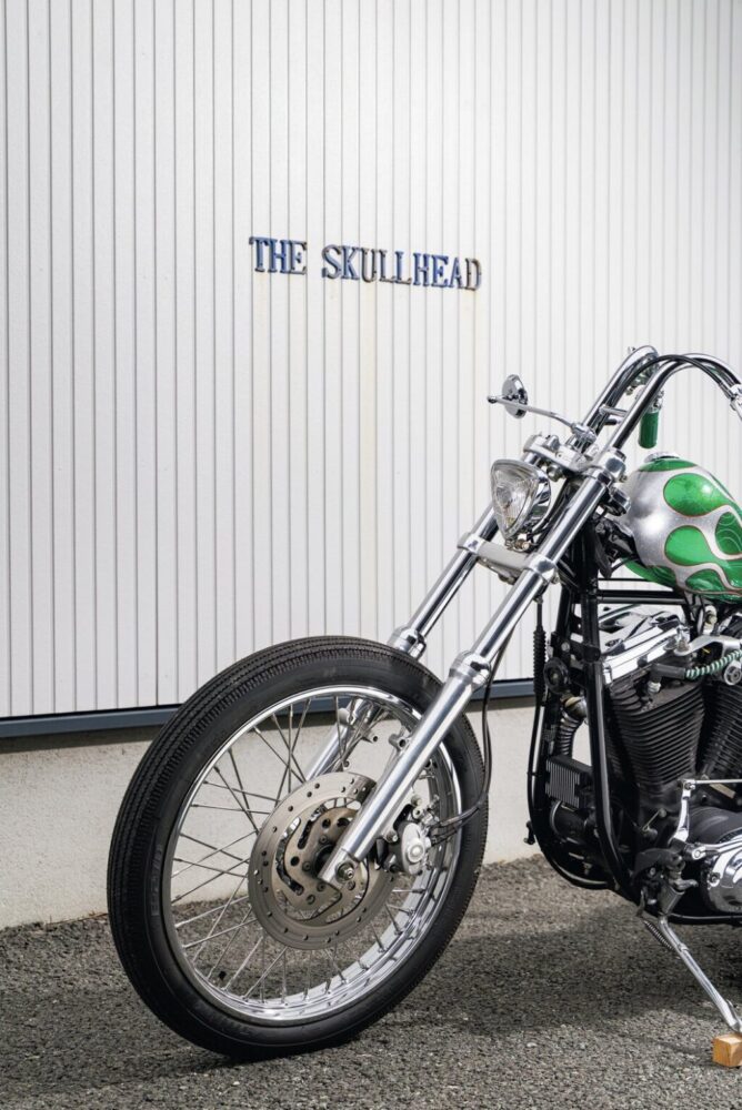 フロント21インチ、リア18インチのセッティングで細身に仕上げた一台。外装色に合わせ、グリップ、ステップ、プラグコードにまでテーマカラーのグリーンを配置するあたりが心憎い。ワンオフのシッシーバーのトップには、店名にちなんでスカルが鎮座する。遊び心ある演出だ。