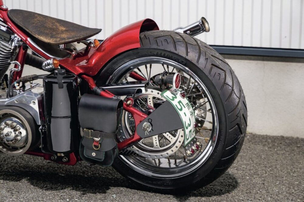「“できるだけ細いチョッパーにしたい”というオーナーさんの意向があったので、“18インチのカスタムはありきたりなので、19インチを入れてみましょう!” と提案しました」というこのマシン。そうして生まれたリアまわりを筆頭に、ペイントやメタルワークで他にない個性を醸し出した一台だ。