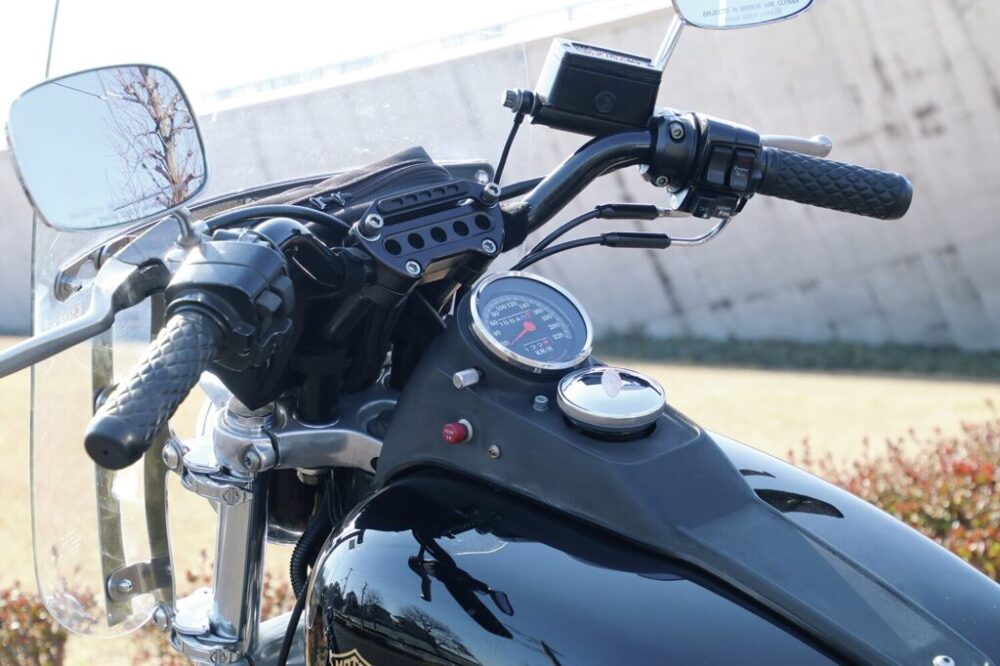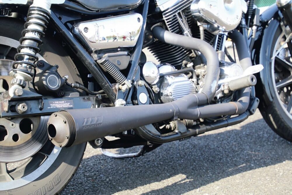 このFXLRにまたがってみたところ、ハンドルさえ交換すれば乗れそうだったので、さっそくプルバックタイプのライザーに交換し、JOYRIDE製のスーパーバーを合わせてポジションを調整。スポーツスターでの事故の経験から足まわりの大切さを学んだので、今後絶対手を入れるそう。