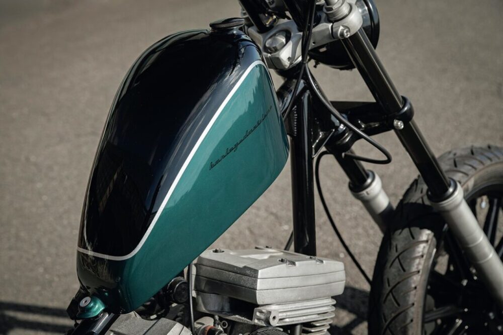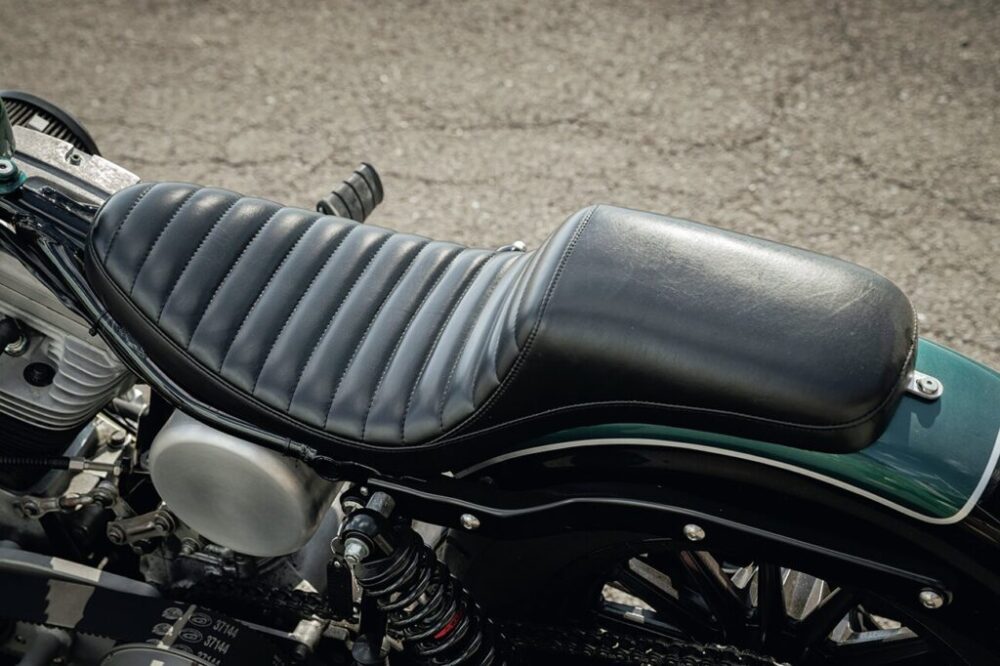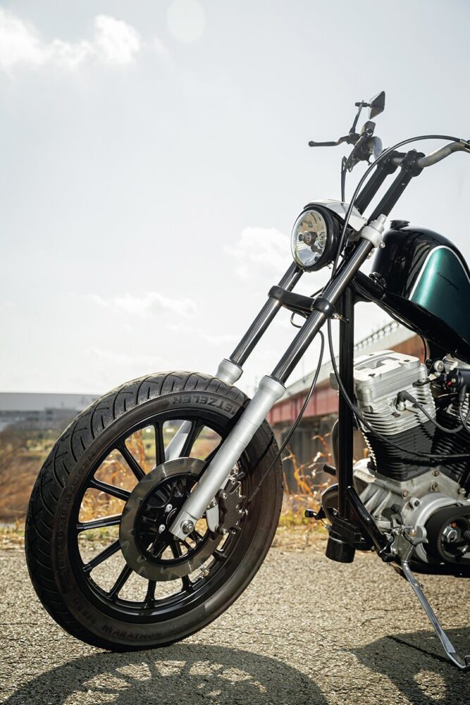 2インチロングの39φフォークにPMキャリパー/Lyndallローターを装備。シングルダウンチューブフレームが車両の最大のアイデンティティ。キャップを最上部に移設したスポーツスタータンク。「Sペイントワークス」が手がけた塗装はオーナーの希望によるフェラーリ・ヴィニャーレをサンプリングしたメタリックグリーン×ブラックで統一。シートは後部座席をややフラットにデザインしたタンデム仕様。