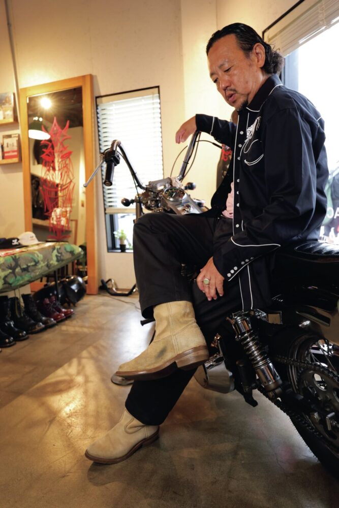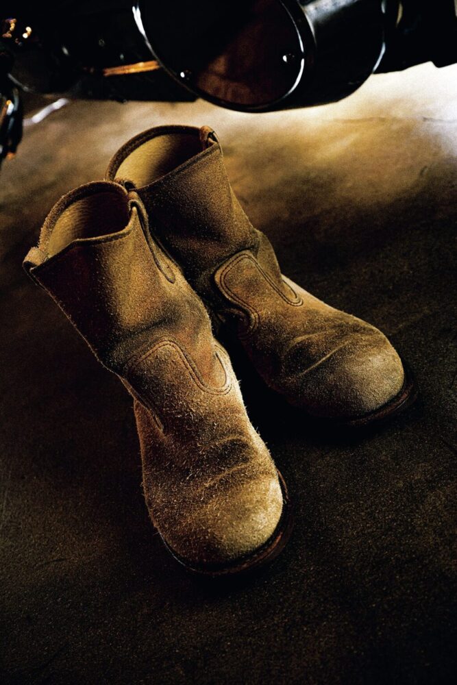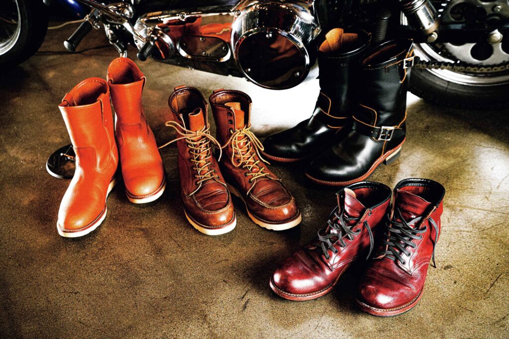 「ずっとバイクに乗ってきたので、エンジニアブーツがファーストRED WINGだと思われがちですが、1990年代はじめ頃に買ったスウェードのペコスが最初の1足です。このカタチは他のブランドでは無かったデザインですし、適度なハイトと足入れのしやすさが気に入りました。もちろんそのあとエンジニアブーツも買いましたが、当時、アメリカのブーツといっても選択肢が少なくて、なかでもRED WINGは他より高かったんですよね。今でも趣味でバイクに乗るのですが、ブーツはユニフォームとして愛用しています」