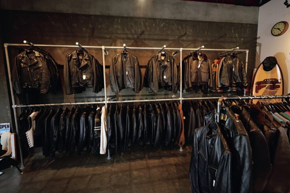 ライダースジャケットを中心にヴィンテージのレザージャケット専門店を営む飯塚氏。自身が長年かけて集めた希少なコレクションがズラリと並ぶ。