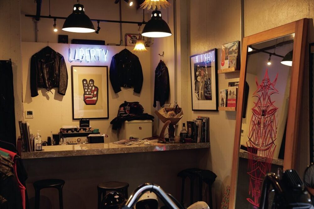 40年近くレザージャケット業界に携わってきた彼が手掛ける店。奥にはヴィンテージライダースジャケットの中でも特にレアなアイテムが飾られている。
